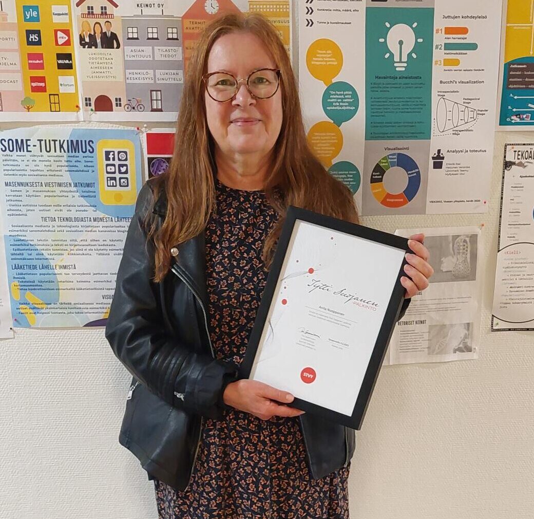 Anita Manner sai palkinnon kunnianhimoisesta, ajankohtaisesta ja analyyttisyydessään vaikuttavasta pro gradu -tutkielmastaan Comparative Analysis of Lexical Bundles in AI-generated vs. Human-written External Software Documentation.